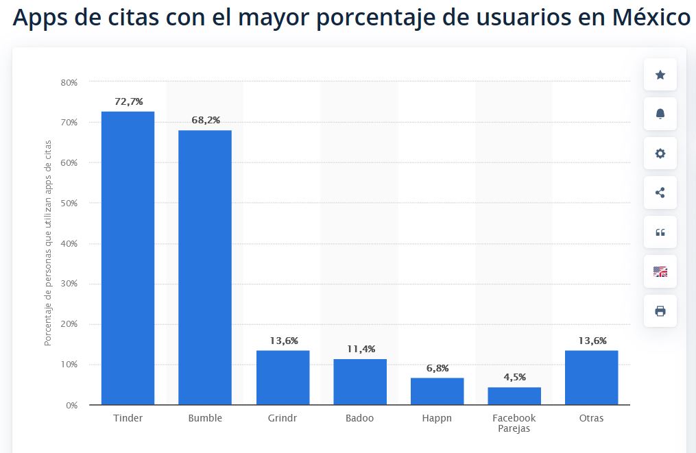 Tinder con un 72.7 de l total de los usuarios en nuestro país; muy cerca se ubica Bumble con un 68,2 por ciento; ya muy abajo sigue Grindr con un 13,6%; seguido de Happn con un 6,8% y al final de este muestreo Facebook Parejas con apenas el 4.5% de usuarios. El resto de las aplicaciones de citas se disputa un 13,6 de usuarios.