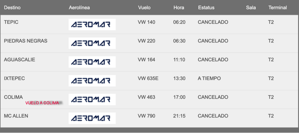 Aeromar a anunciado que 5 rutas incluyendo Colima que ale desde el Aeropuerto Internacional de la Ciudad de México a Tepic, Piedras Negras, Aguascalientes, y Mc Allen para el día de hoy 15 de febrero de 2023 son canceladas.