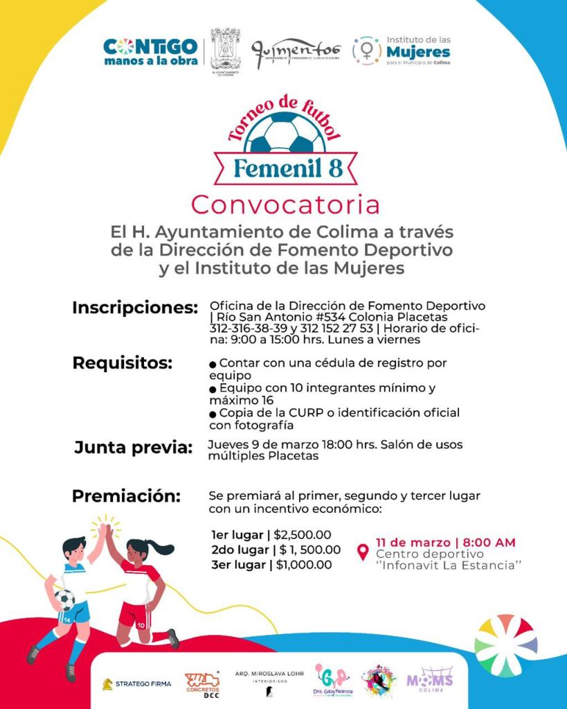 Como parte de las actividades de la Semana de la Mujer en la capital del estado, el Ayuntamiento de Colima que encabeza la presidenta municipal, Margarita Moreno, anunció el primer Torneo de Futbol Femenil 8, que se realizará el próximo sábado, 11 de marzo, en el Centro deportivo “Infonavit La Estancia”.