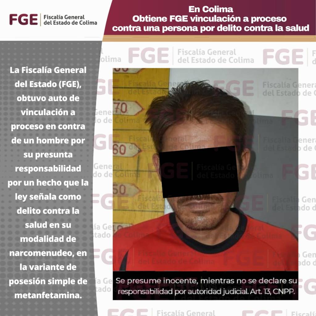 La Fiscalía General del Estado (FGE), obtuvo auto de vinculación a proceso en contra de un hombre por su presunta responsabilidad por un hecho que la ley señala como delito contra la salud en su modalidad de narcomenudeo, en la variante de posesión simple de metanfetamina.
