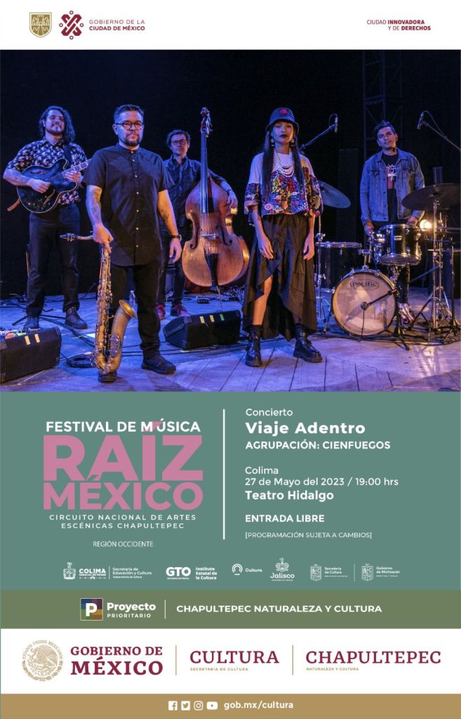 Asimismo, el 27 de mayo, la banda Cienfuegos, conformada por un quinteto de músicos originarios de Guadalajara Jalisco, y fundada en 2014, deleitará a la audiencia con el espectáculo “Viaje Adentro”, un concierto que nos llevará por una travesía introspectiva que alude al viaje interno por el que la humanidad se vio inmersa durante la pandemia del Covid-19.