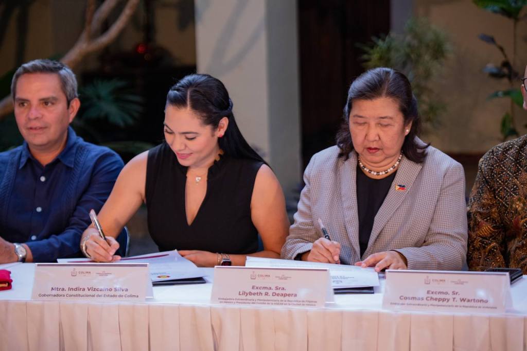 La tarde de este miércoles, la gobernadora Indira Vizcaíno Silva firmó una Declaración Conjunta entre el Gobierno de Colima, Universidad de Colima y las embajadas de los países que integran la Asociación de Naciones de Asia Sudoriental (ASEAN), tras la gira que la representación diplomática tuvo por la entidad en misión de negocios, con el compromiso de explorar posibilidades de cooperación en áreas de mutuo interés como el comercio y la inversión, la educación, la cultura, el turismo y el cuidado medioambiental, entre otras.