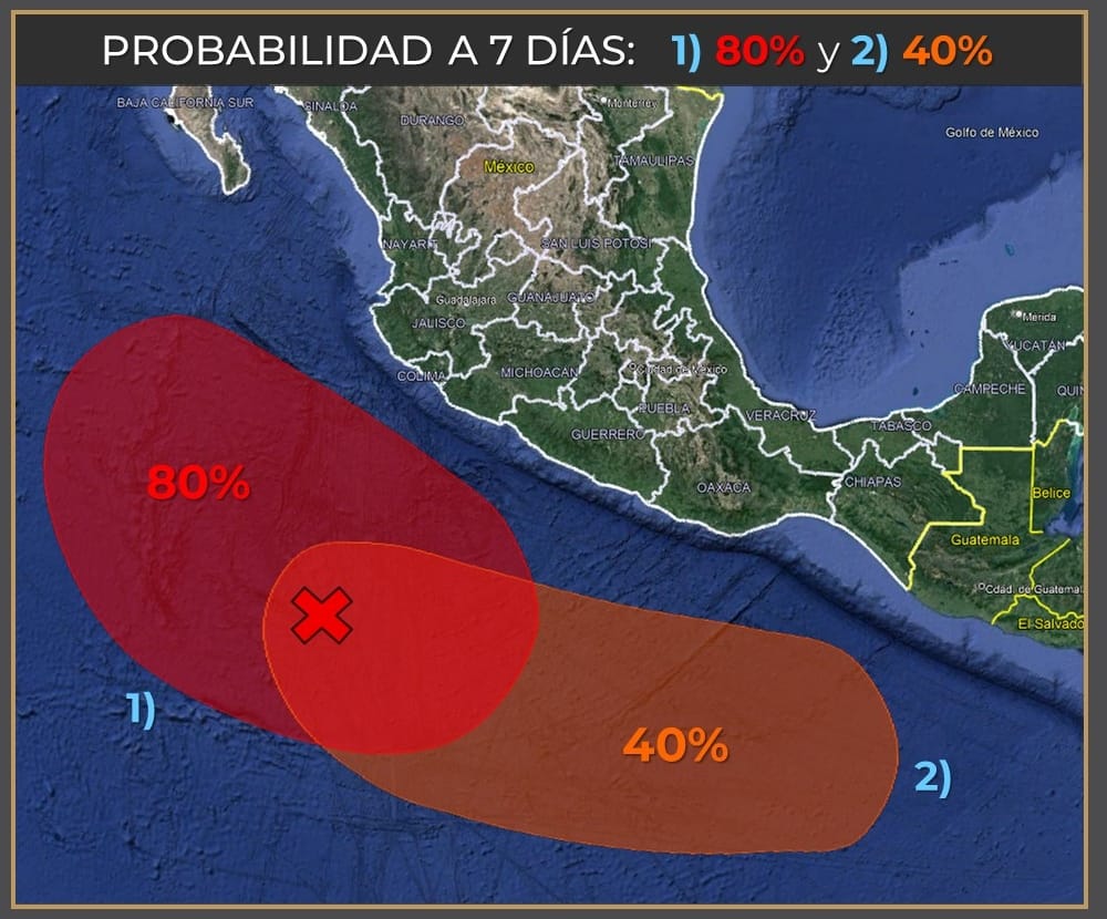 El organismo de la Comisión Nacional del Agua (Conagua), fuente oficial del Gobierno de México, informó que este día, la onda tropical Núm. 9 se integrará a la circulación de una zona de baja presión con alta probabilidad para desarrollo ciclónico, la cual se localiza al sur de las costas de Colima y Jalisco y Colima, reforzando la probabilidad de lluvias puntuales muy fuertes en el occidente del país.