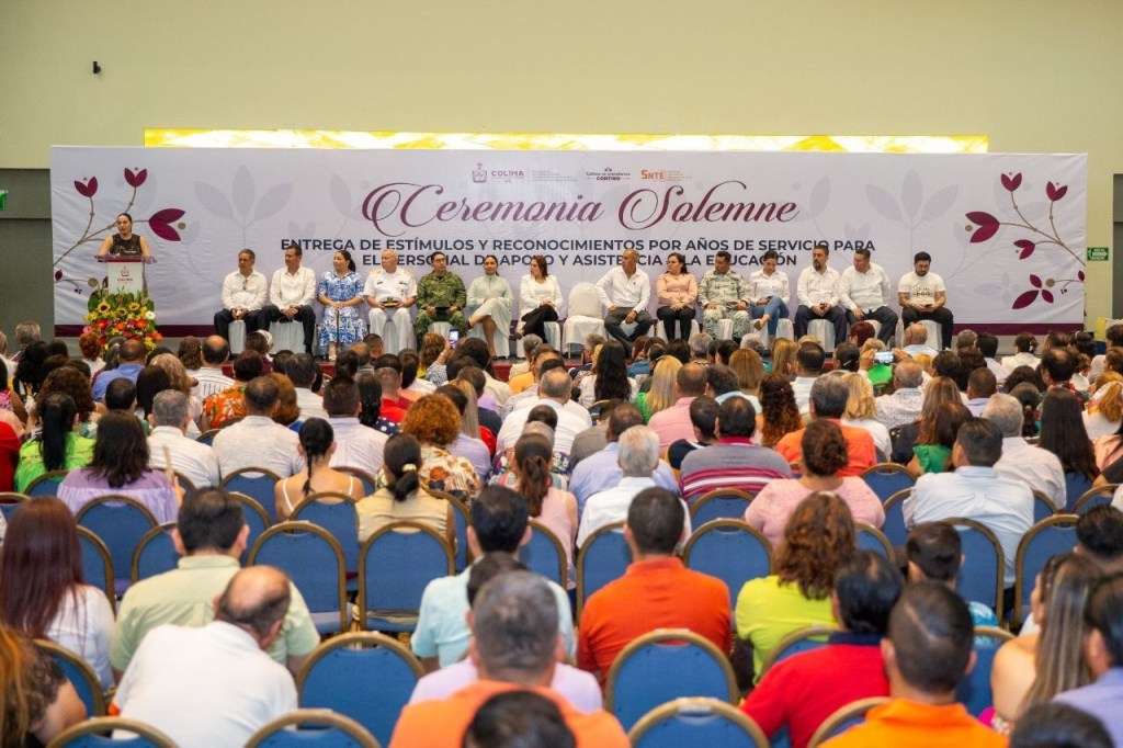 La tarde de este viernes, la gobernadora del estado de Colima, Indira Vizcaíno Silva, presidió la ceremonia solemne de entrega de estímulos por años de servicio a personal administrativo de la Secretaría de Educación y Cultura, así como la entrega de quince bases a integrantes del Sindicato Nacional de Trabajadores de la Educación (SNTE); ahí manifestó que los gobiernos de la Cuarta Transformación ven a la educación como una prioridad para transformar a nuestra sociedad.