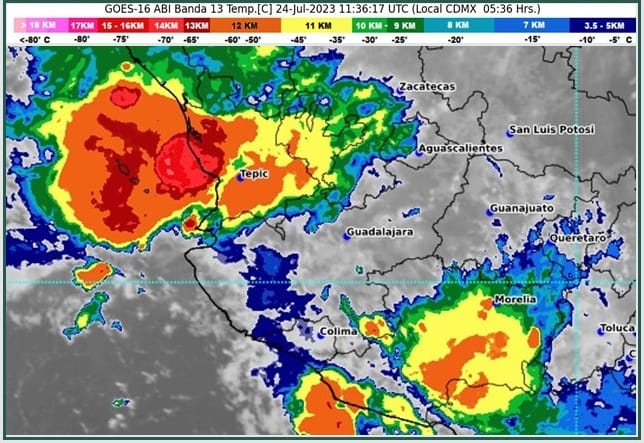 El Servicio Meteorológico Nacional (SMN), fuente oficial del Gobierno de México, prevé que en algunos municipios del estado de Colima podrían registrarse lluvias fuertes con puntuales muy fuertes de hasta 75 milímetros, lo mismo para Jalisco, Michoacán, Guerrero, Ciudad de México, Estado de México, Sinaloa, Nayarit, Morelos, Puebla, Hidalgo y San Luis Potosí.