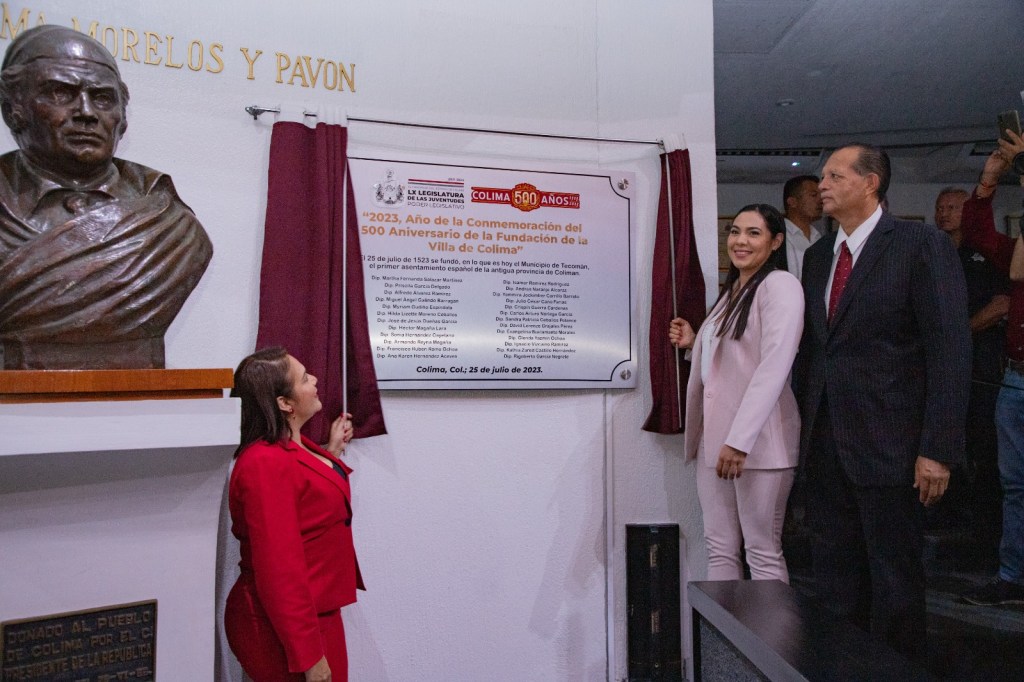 La gobernadora Indira Vizcaíno Silva asistió este martes a la sesión solemne en el Congreso del Estado de Colima, donde develó la placa con la leyenda ‘2023, año de la conmemoración del 500 aniversario de la Fundación de la Villa de Colima’; señaló que este testimonio debe ser recordatorio del imperativo moral para servidoras y servidores públicos, y también para las y los colimenses, de dejar un legado mejor del Colima que encontramos. «La obligación que tenemos, es dejar a quienes vienen detrás, una mejor Colima que la que recibimos de quienes nos antecedieron» expresó la titular del Poder Ejecutivo.