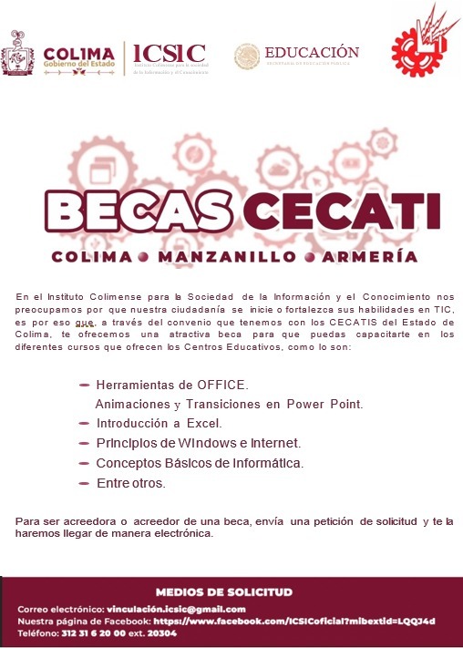 El Gobierno del Estado de Colima, a través del Instituto Colimense para la Sociedad de la Información y el Conocimiento (ICSIC) ofrece una serie de becas de descuento para ingresar y participar en los cursos de competencias digitales en los Centros de Capacitación para el Trabajo Industrial (Cecati) de Colima, Manzanillo y Armería, a fin de fortalecer la alfabetización digital en nuestra entidad.