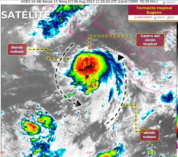 Hoy domingo, la tormenta tropical ‘Eugene’ se localizará al suroeste de la península de Baja California y su amplia circulación originará lluvias puntuales muy fuertes en Colima, Jalisco y Baja California Sur, así como lluvias puntuales fuertes en Nayarit, con rachas de viento de 60 a 70 kilómetros por hora en Baja California Sur y oleaje elevado en costas de Nayarit, sur de Sinaloa y Baja California Sur.