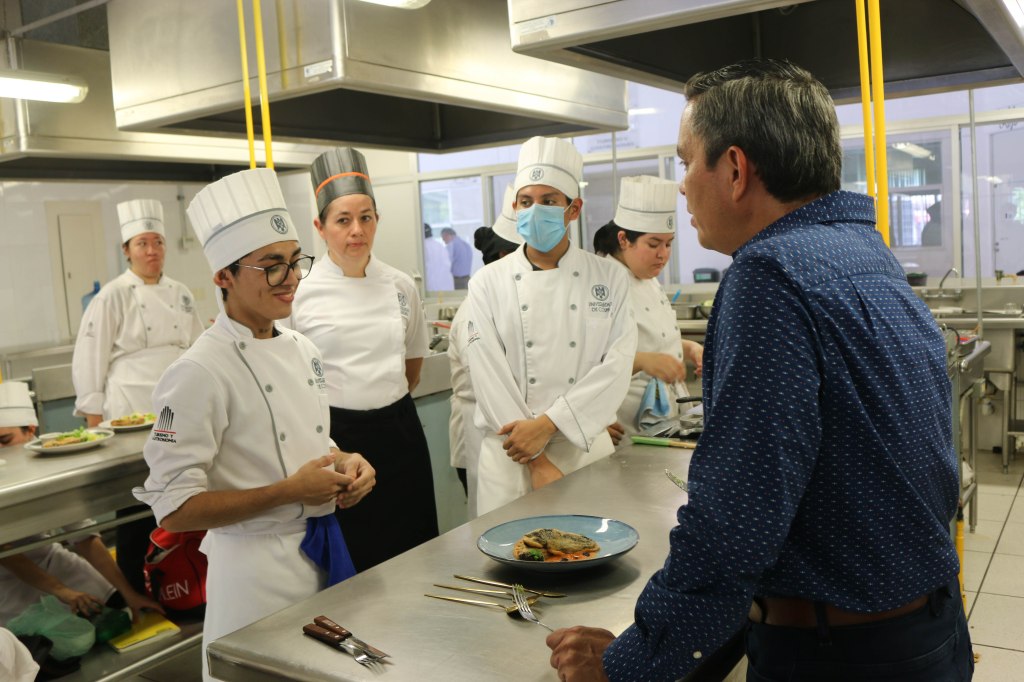 Torres Ortiz realizó un breve recorrido por las cocinas de la escuela, donde probó algunos platillos elaborados por estudiantes para la materia “Cocina mexicana tradicional”, a cargo de la maestra Itzel Sosa-Argáez. Además, quienes ahí estudian le explicaron los ingredientes y técnicas: chile chipotle relleno de plátano macho y queso de cabra, ensalada y vinagreta de almendras y pasas y chile pasilla relleno de picadillo en caldo de jitomate.