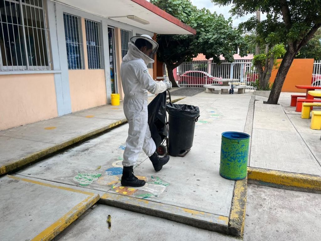 Oficiales de la Unidad Estatal de Protección Civil acudieron a retirar el enjambre para disminuir el riesgo a estudiantes y personal docente que se encontraba en el sitio.