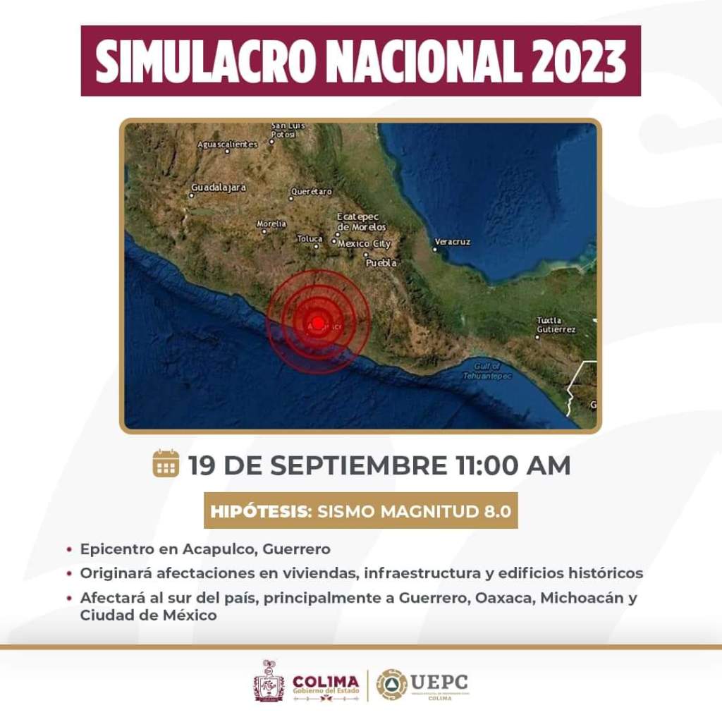 Recordó que, en el estado de Colima, la hipótesis seleccionada para llevar a cabo este simulacro se basa en un sismo magnitud 8.0 con epicentro en Acapulco, Guerrero, ocasionando daños en infraestructura, edificios históricos y viviendas; “la protección civil y seguridad es nuestra misión, y cada uno de ustedes desempeña un papel fundamental. Estamos comprometidos en proteger y salvar vidas. Hagámoslo juntos”