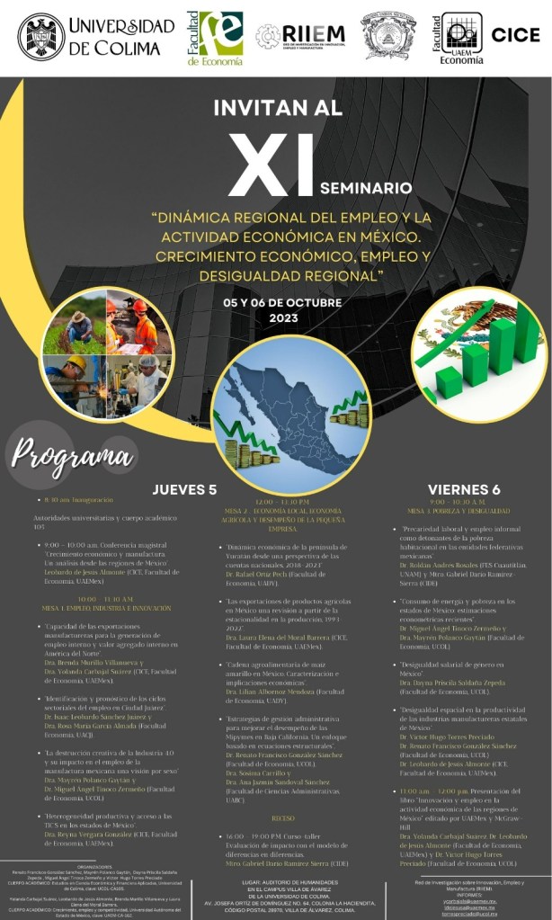 El evento está siendo organizado por miembros del Cuerpo Académico 105 de la Facultad de Economía de la UdeC y el Cuerpo Académico 162 de la Facultad de Economía de la Universidad Autónoma del Estado de México (UAEMEX), como parte de la Red de Innovación, Investigación, Empleo y Manufactura (RIIEM).