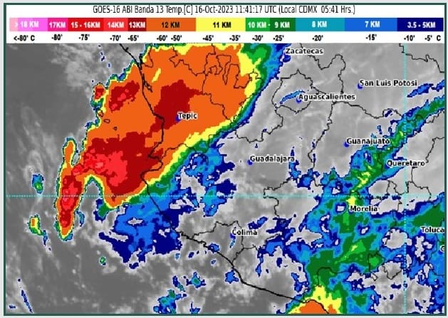 Hoy lunes 16 de octubre, una zona de baja presión con probabilidad para desarrollo ciclónico al sur de las costas de Guerrero y Michoacán, y un canal de baja presión sobre el noreste de México, propiciarán lluvias fuertes a muy fuertes en algunos municipios del estado de Colima, así como en zonas de la región occidente y el sur de la República Mexicana.