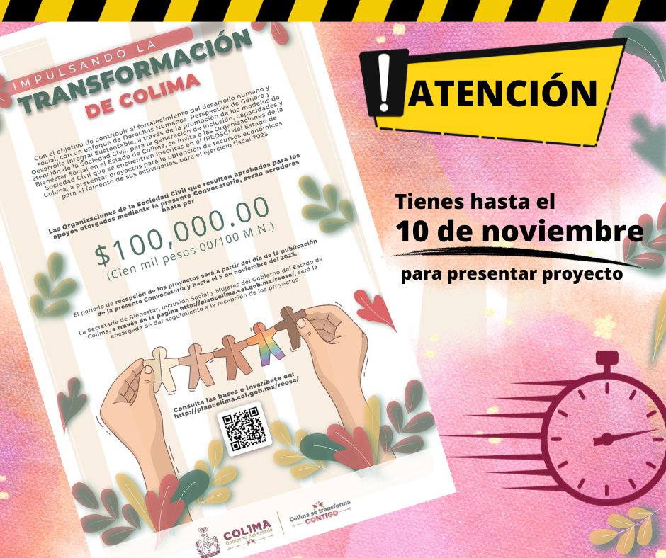 Zalia María Gutiérrez Verduzco, encargada del despacho de la Secretaría de Bienestar, Inclusión Social y Mujeres (Sebiinsom) del Gobierno del Estado de Colima, y el presidente del Consejo Estatal de Participación Ciudadana, Fernando Briceño Rodríguez, informaron la ampliación del plazo para la presentación de proyectos dentro de la convocatoria ‘Impulsando la trasformación de Colima’, que cerrará este viernes 10 de noviembre.