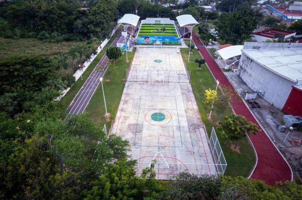 En este lugar se realizan trabajos de mejoramiento de la iluminación del módulo deportivo y el estacionamiento, así como los acabados, cambio de pasto sintético, pintura, colocación de tableros, intervención de la pista de tartán.