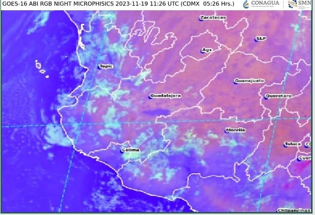 En el Pacífico Centro se espera cielo medio nublado en la mañana y nublado en el transcurso de la tarde, con intervalos de chubascos que podrían acompañarse de descargas eléctricas en Colima, Jalisco y Michoacán, además de lluvias aisladas en Nayarit.