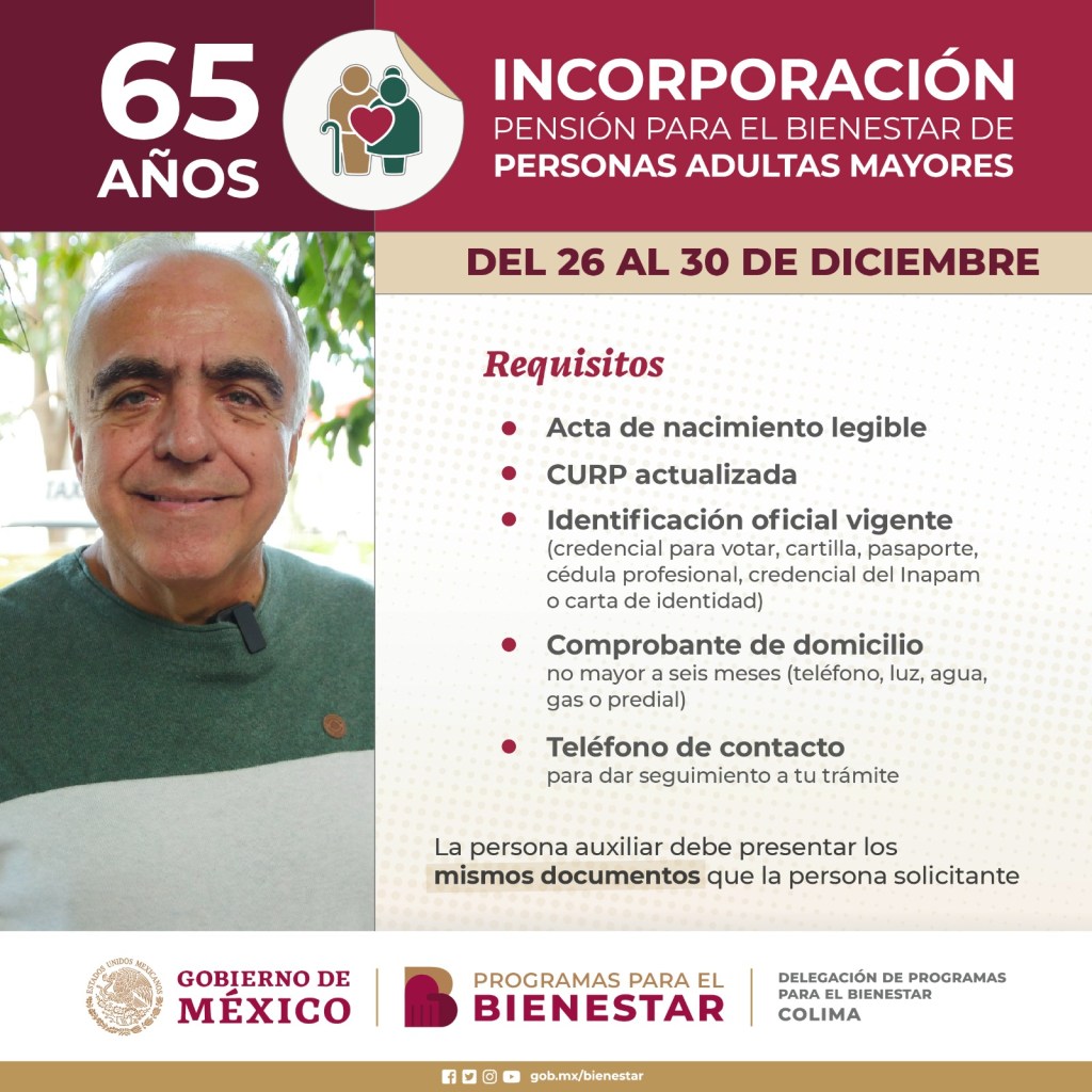 Esta mañana dio inicio el periodo de ampliación del plazo, del 26 al 30 de diciembre, para que las y los colimenses que aún no lo han hecho, acudan a solicitar su incorporación a la Pensión para el Bienestar de las Personas Adultas Mayores, informó la delegada de Programas para el Bienestar en la entidad, Viridiana Valencia Vargas.