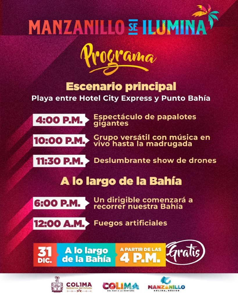 Además, a lo largo de la Bahía de Manzanillo, las personas asistentes podrán disfrutar del recorrido de un dirigible a las 18:00 horas, ofreciendo una perspectiva única de la zona costera. Lo mejor y llegará al final de la celebración, con el espectáculo de fuegos artificiales a la medianoche para iluminar el cielo y dar la bienvenida al nuevo año 2024 de una manera espectacular.