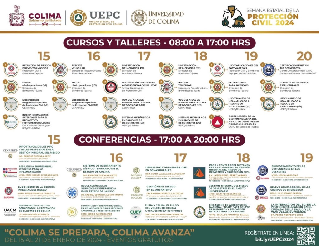 La Unidad Estatal de Protección Civil (UEPC) del Gobierno del Estado de Colima dio a conocer que, del 15 al 21 de enero, se llevará a cabo la Semana Estatal de la Protección Civil, en la que se impartirán cerca de cuarenta talleres y conferencias de manera gratuita, que van dirigidos a las instituciones de atención de emergencias y unidades internas de Protección Civil en esta entidad.