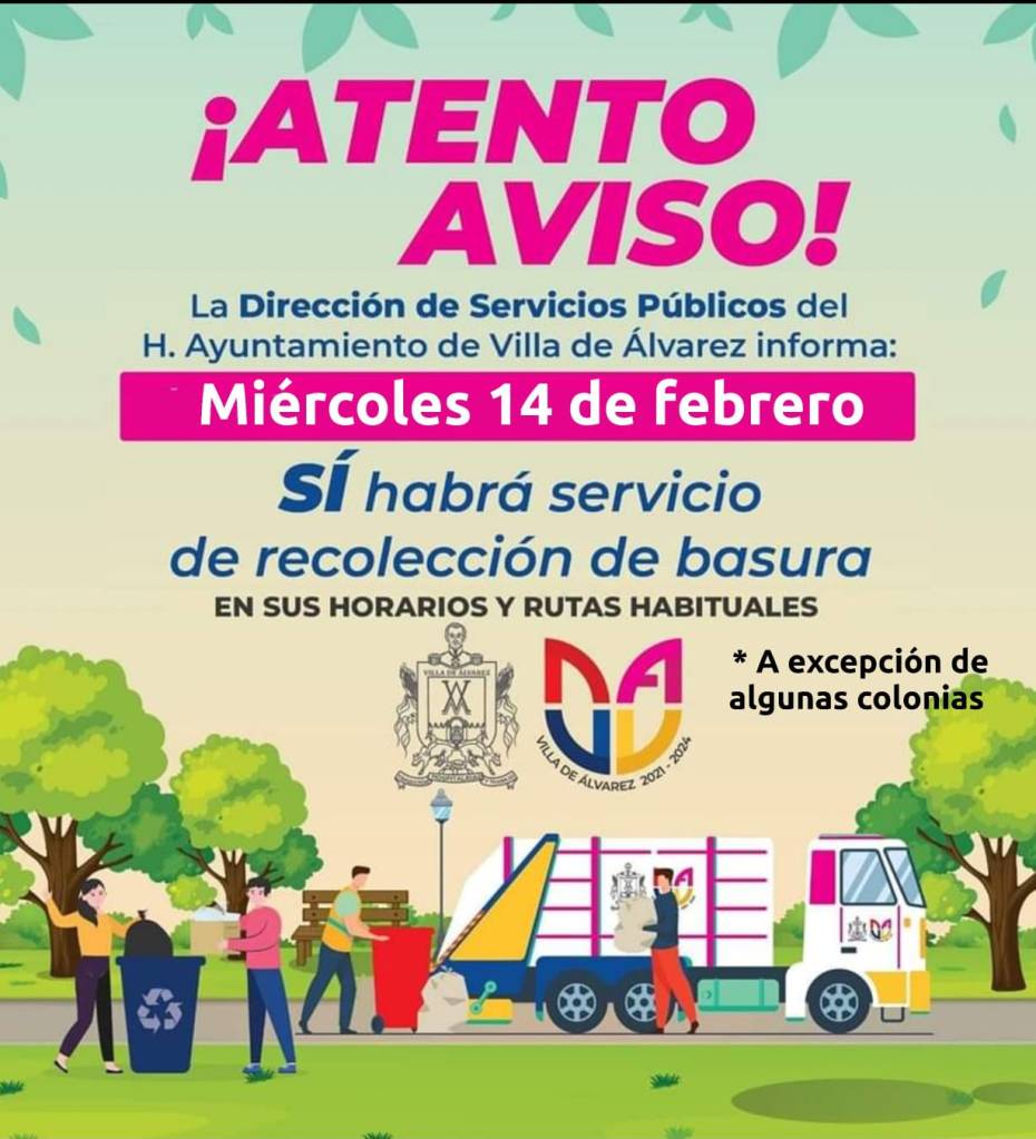 Villa de Álvarez, Col.- El Ayuntamiento de Villa de Álvarez, a través de la Dirección General de Servicios Públicos, informa a la población que este miércoles 13 de febrero el servicio de recolección de basura se prestará de manera habitual, con excepción del adelanto de los turnos vespertino y nocturno en algunas colonias.