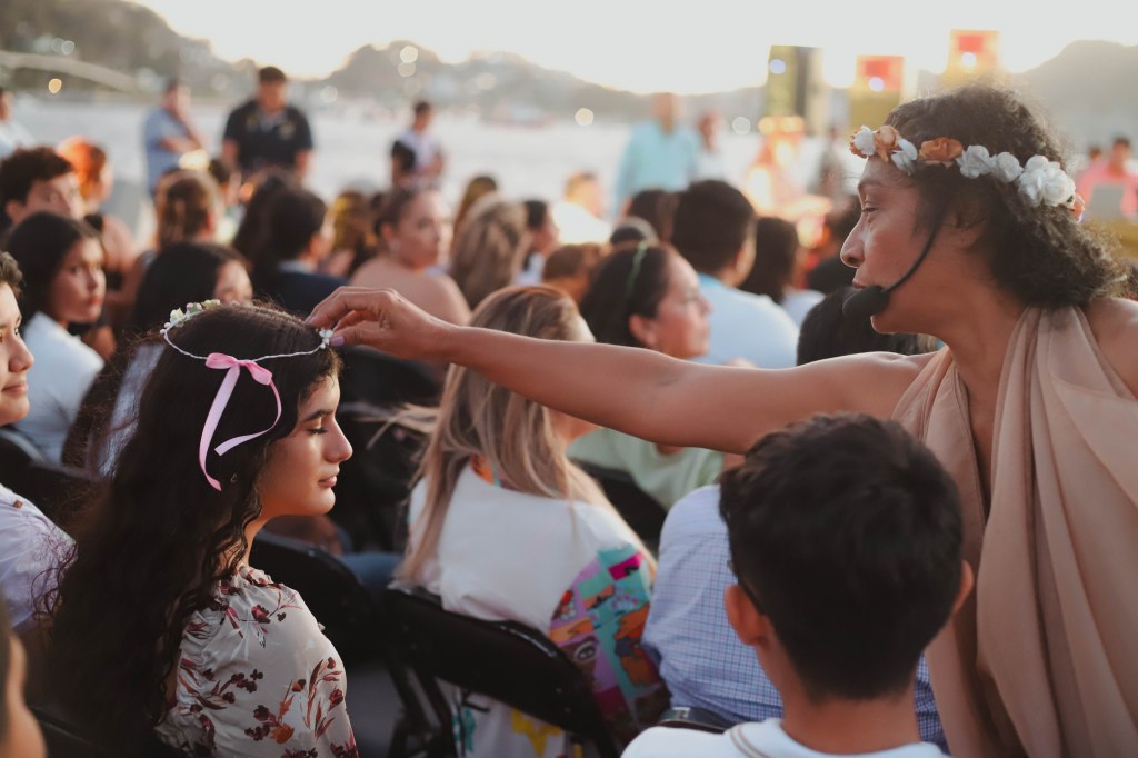 Carmen Solorio y las integrantes del Taller de Teatro Experimental, vestidas de musas, coronaron a mujeres y hombres como símbolo de solidaridad y cariño. Esta propuesta invitó a la reflexión sobre el papel de cada persona en sus acciones frente a la vida.