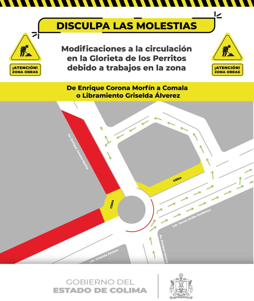 Se informa que, a partir del próximo martes 12 de marzo, la Glorieta de los Perritos (en Villa de Álvarez) estará cerrada a la circulación vehicular por aproximadamente cuatro semanas para brindar seguridad a las y los usuarios debido a los trabajos en la zona y tratando de evitar en la medida de lo posible afectar el flujo de esta importante vialidad intermunicipal se harán distintas modificaciones a la circulación que a continuación se describen: