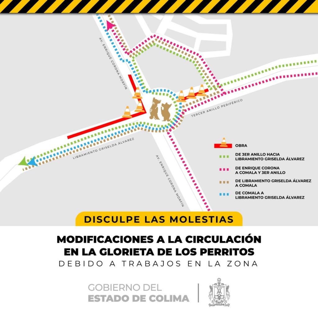 Se recuerda a la población que, a partir de este martes 12 de marzo, la circulación vehicular en la ‘Glorieta de los Perritos’ (en la carretera Villa de Álvarez-Comala) será modificada y reducida, por lo que se hace un llamado a todas las personas que transiten por ese lugar a conducir con precaución, obedecer los señalamientos colocados para brindar seguridad en la zona y evitar accidentes.
