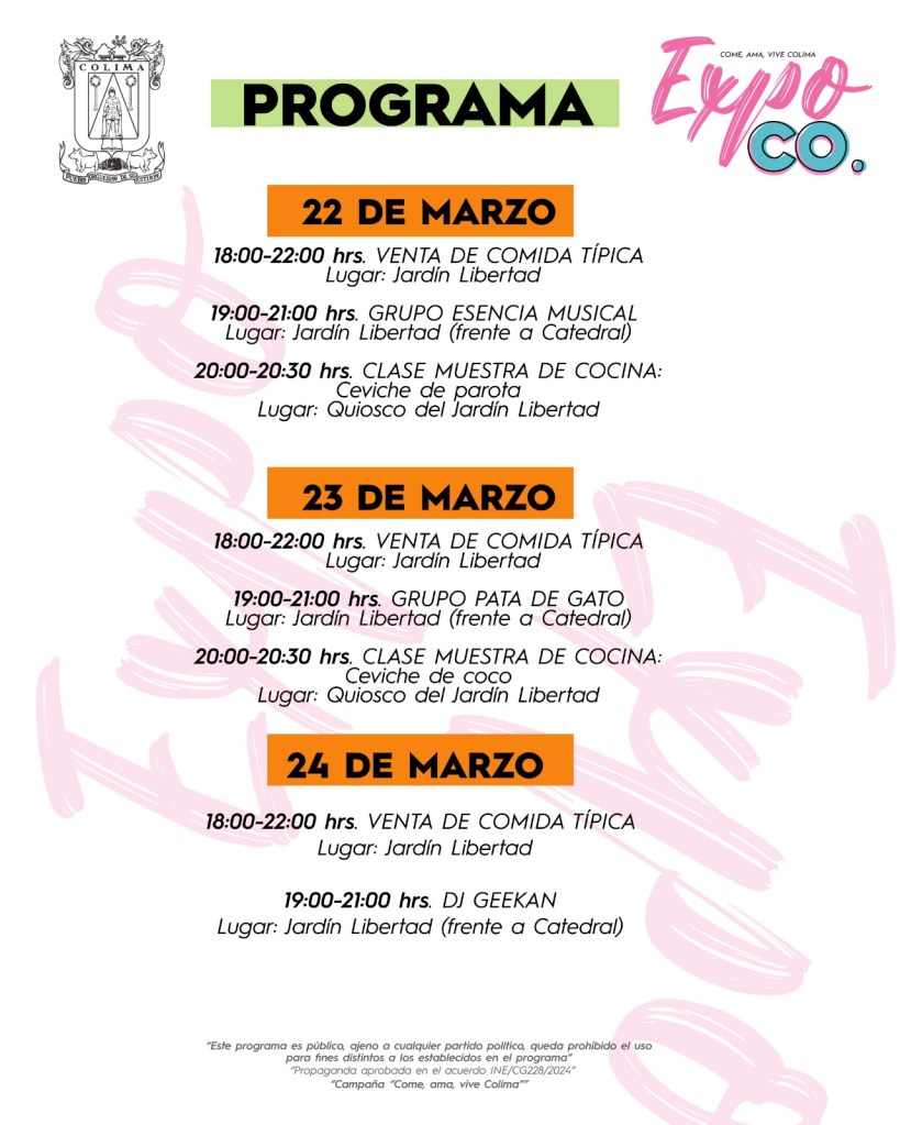 Este viernes, 22 de marzo, a partir de las 6:00 de la tarde, hasta las 10:00 de la noche, se tendrá la venta de comida típica de Colima, en tanto, el Grupo Esencia Musical amenizará el jardín principal, a partir de las 07:00 de la noche.