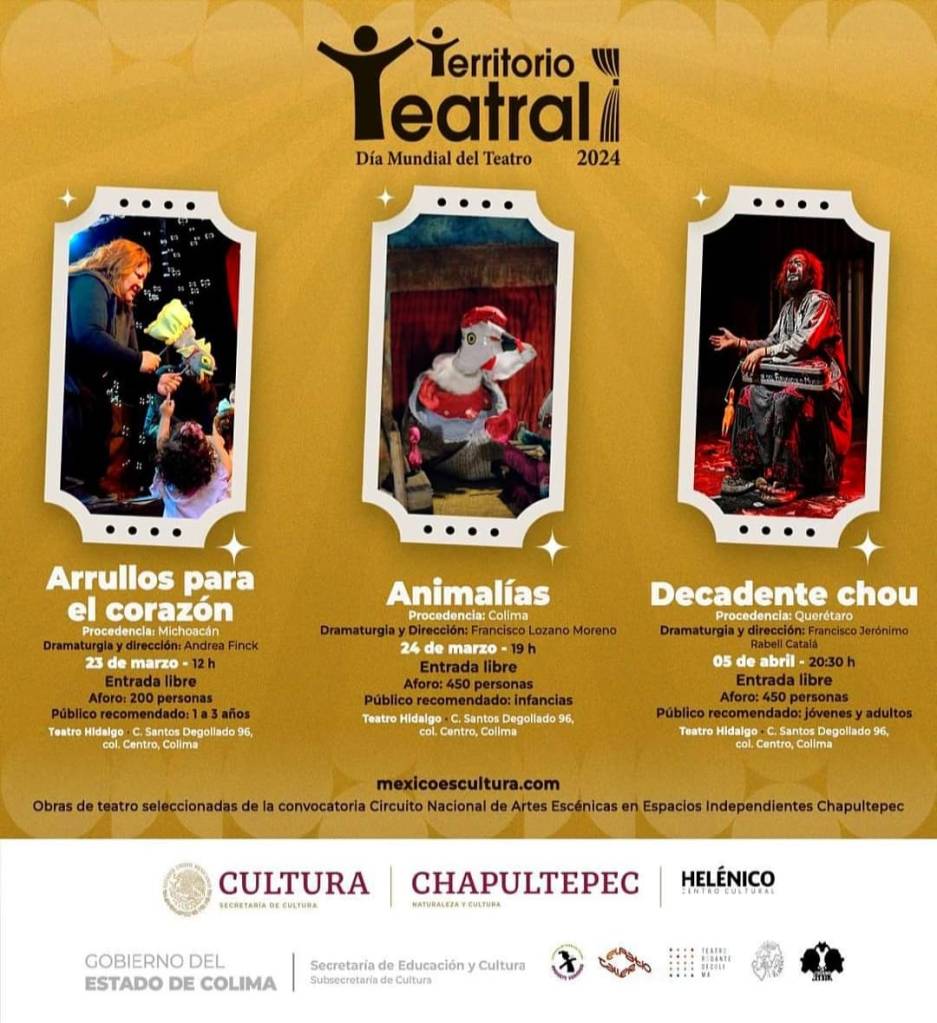 En Colima, inició con la puesta en escena “Arrullos para el corazón”, y este domingo 24 de marzo se presenta “Animalías” dirigida a las infancias en general, mientras el próximo 5 de abril estará “Decadente chou” para jóvenes y adultos. Todas las funciones serán en el Teatro Hidalgo, en el centro histórico de la ciudad de Colima.