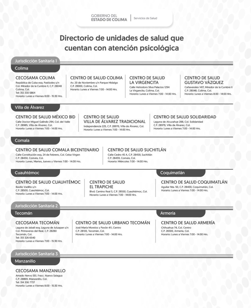 Un tratamiento adecuado puede dar una mejor calidad de vida y puede proporcionarse en los Centros Comunitarios de Salud Mental y Adicciones (Cecosama) de Colima, Tecomán y Manzanillo, así como en Centros de Salud, con la detección de estos problemas de salud mental. Si necesitas estos servicios en salud, checa la imagen anexa a esta información y acude al más cercano.