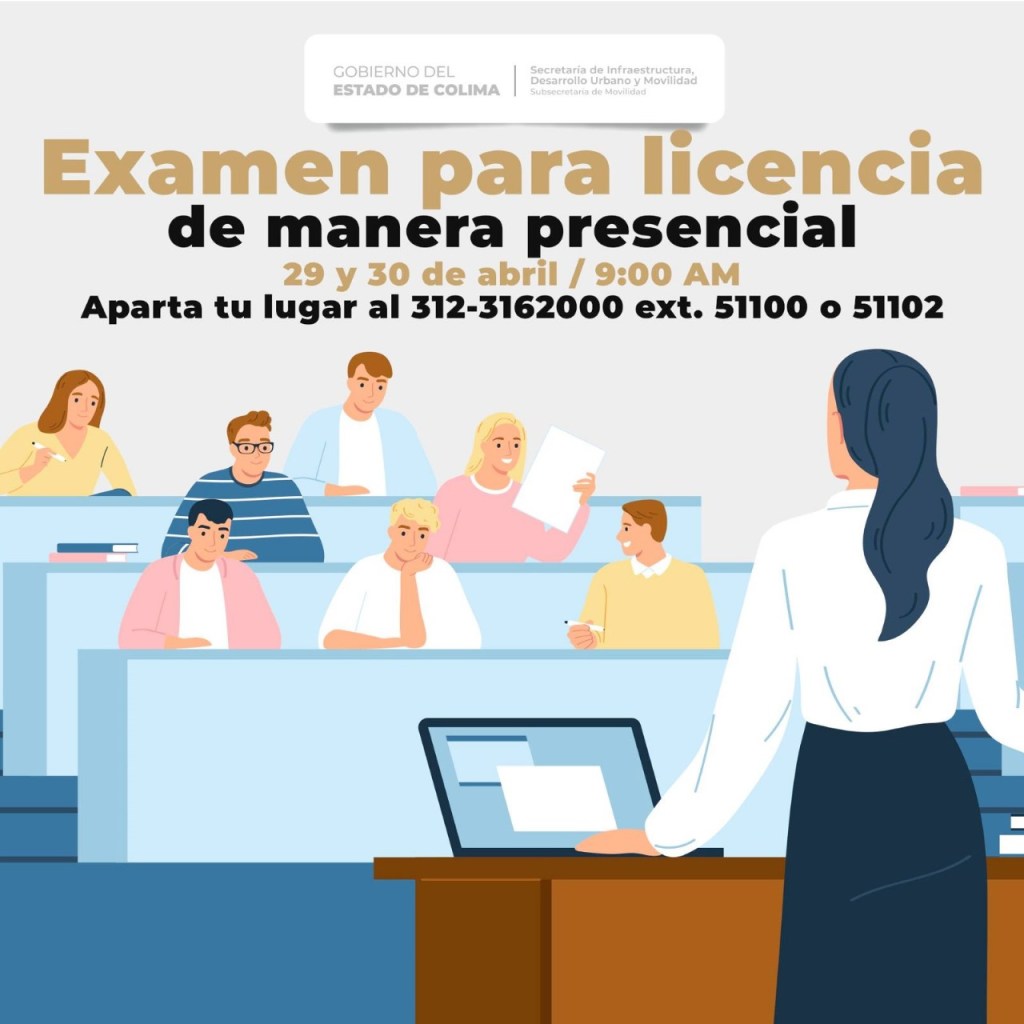 El mensaje está dirigido a las personas que no han podido realizar su examen en línea o lo han reprobado previamente. Quienes deseen realizar este examen presencial, deben de comunicarse al teléfono 312-316-2000 (extensión 51100 y 51102), de 9:00 de la mañana a 2:00 de la tarde, para agendar la cita correspondiente.