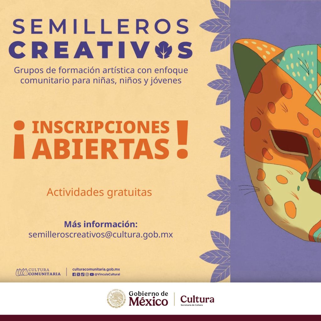 La Secretaría de Cultura del Gobierno de México, a través del programa Cultura Comunitaria, invita a niñas, niños y jóvenes de todas las regiones del país a formar parte de los Semilleros Creativos: grupos de formación artística gratuita con enfoque comunitario, conformados por infancias y juventudes en condiciones de vulnerabilidad social, quienes han encontrado en el arte una herramienta de transformación y construcción de paz.