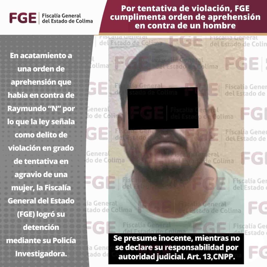 En acatamiento a una orden de aprehensión que había en contra de Raymundo “N” por lo que la ley señala como delito de violación en grado de tentativa en agravio de una mujer, la Fiscalía General del Estado (FGE) logró su detención mediante su Policía Investigadora.