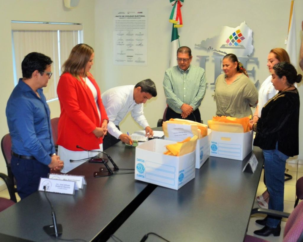 En el acto protocolario de entrega-recepción que se llevó a cabo en la sala de sesiones del Consejo General, el Consejero Presidente Provisional del IEE, Juan Ramírez Ramos; recibió de manos de la Diputada Presidenta de la Mesa Directiva del Congreso del Estado, Irma Mirella Martínez Silva; los listas de quienes aparecerán en las boletas de las elecciones del próximo domingo 01 de junio.