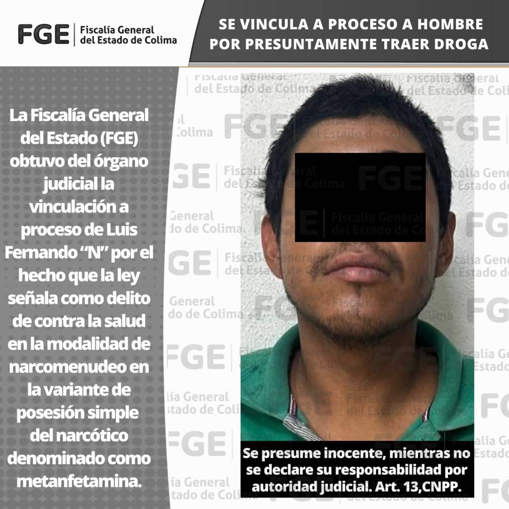 La Fiscalía General del Estado (FGE) obtuvo del órgano judicial la vinculación a proceso de Luis Fernando “N” por el hecho que la ley señala como delito de contra la salud en la modalidad de narcomenudeo en la variante de posesión simple del narcótico denominado como metanfetamina.