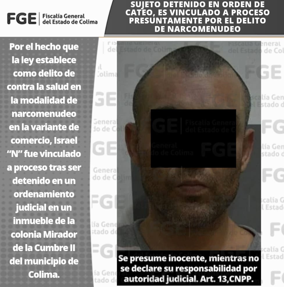 Por el hecho que la ley establece como delito de contra la salud en la modalidad de narcomenudeo en la variante de comercio, Israel “N” fue vinculado a proceso tras ser detenido en un ordenamiento judicial en un inmueble de la colonia Mirador de la Cumbre II del municipio de Colima.