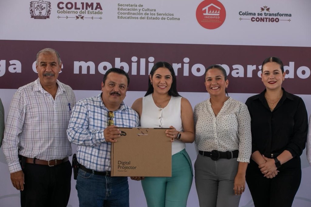 La gobernadora Indira Vizcaíno Silva, entregó 242 juegos de escritorios y sillas para docentes de secundaria, así como 81 proyectores a 18 planteles urbanos de los municipios de Colima y Villa de Álvarez, con inversión superior a 2.3 millones de pesos, en un evento que se realizó este lunes en la escuela secundaria Manuel Álvarez, en el municipio villalvarense.