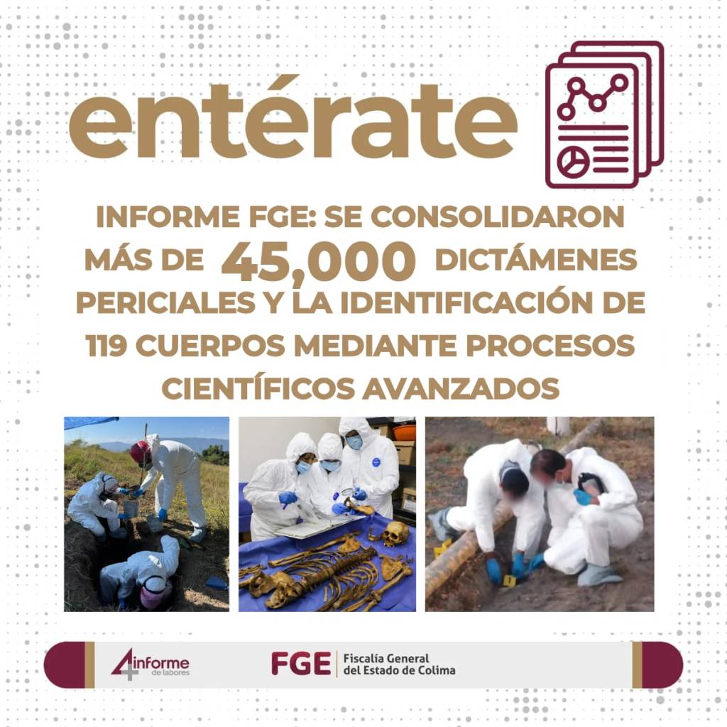 Uno de los logros más relevantes de esta dependencia, ha sido la identificación y restitución digna de personas, una labor de gran sensibilidad social. A través de un trabajo coordinado entre campo y gabinete, se logró la identificación científica de 119 cuerpos bajos los procesos de Genética Forense, Lofoscopía, Antropología, Odontología e Identificación Humana. Además, se elaboraron 41 fichas de Personas Fallecidas Identificadas No Reclamadas, que fueron difundidas a través del nuevo apartado en la página web de la Fiscalía, titulado “Personas Fallecidas Identificadas No Reclamadas”, permitiendo que 31 persona fallecidas que contaban con esta ficha dentro de la plataforma web, ya se han restituidos a sus familiares.