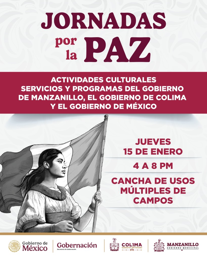 Con el propósito de continuar atendiendo las causas que generan la violencia, el Gobierno de Manzanillo, en coordinación con la Subsecretaría de Construcción de Paz del Gobierno de México y el Gobierno del Estado de Colima, llevará a cabo la primera Jornada por la Paz del año este jueves 15 de enero, en las canchas de usos múltiples de Campos.