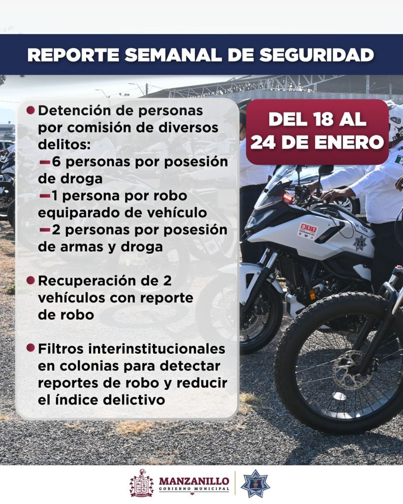 La Dirección de Seguridad Pública de Manzanillo informa que, durante la semana pasada, se logró la detención de seis personas por posesión de sustancias ilícitas, una por robo equiparado de vehículo y dos por portación de armas de fuego con cartuchos útiles.