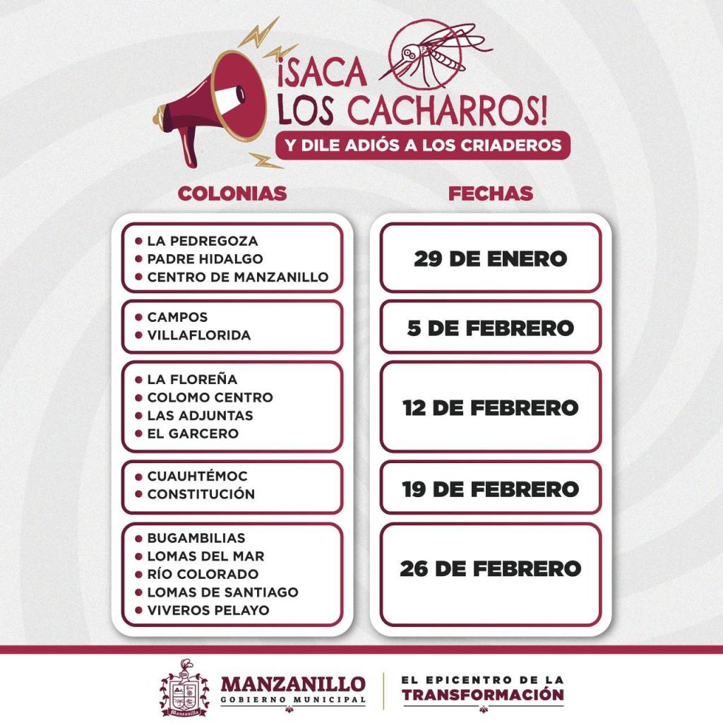 Con el objetivo de eliminar criaderos de mosquitos y reforzar la prevención del dengue, el Gobierno de Manzanillo, encabezado por la presidenta Rosi Bayardo, llevará a cabo una jornada de descacharrización, enfocada en retirar objetos en desuso que puedan acumular agua y convertirse en criaderos del mosquito transmisor.