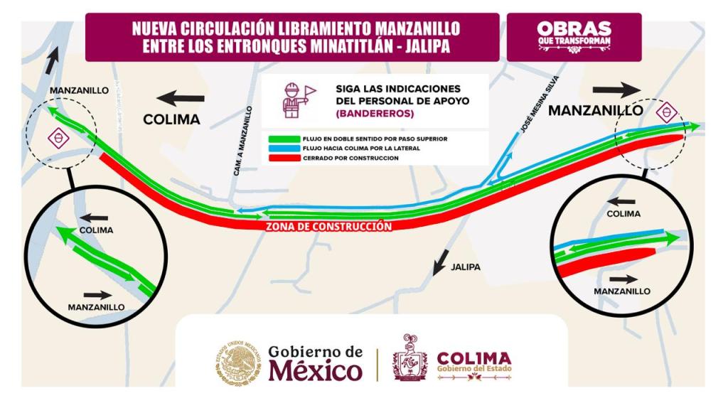 Se informa a las y los conductores que por la vialidad lateral únicamente se mantendrá el flujo vehicular en el sentido Manzanillo–Colima, mientras que por la estructura del puente el tránsito será en ambos sentidos. Se exhorta a la ciudadanía a tomar precauciones, atender las indicaciones del personal operativo y reducir la velocidad al circular por la zona.